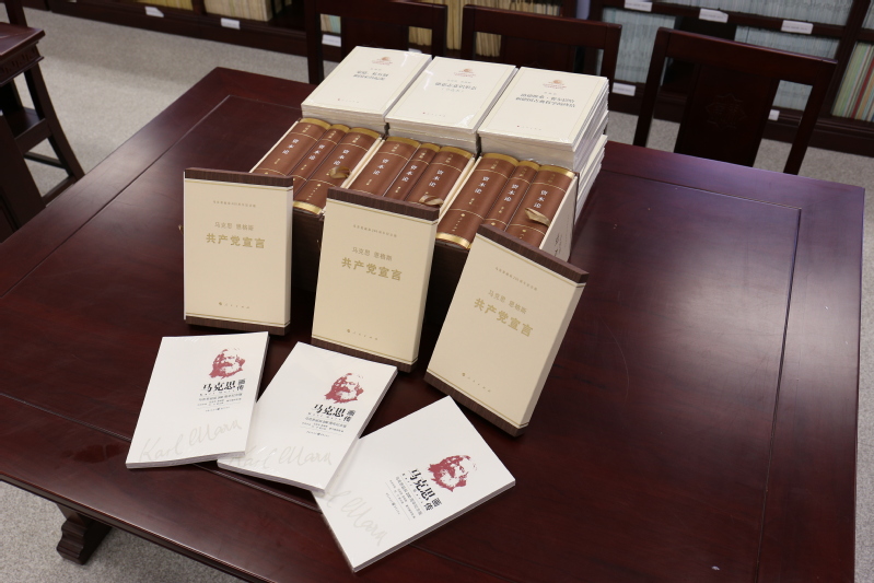 2018年6月,人民出版社向我院慷慨捐赠了3套纪念马克思诞辰200周年重点图书,其中每套包括人民出版社出版的《共产党宣言》《资本论》纪念版、“马克思恩格斯著作特辑”,重庆出版集团出版的《马克思画传》,共计60册。
