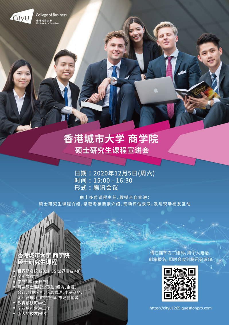 兹定于12月5日(周六)下午3点至4点半将专门针对贵校和其它几所内地双一流大学推出我们香港城市大学商学院硕士生课程的宣讲会,宣讲会将于腾讯会议的形式进行,届时会有十多位课程的负责教授介绍课程,部分课程会当场预录取一部分学生。