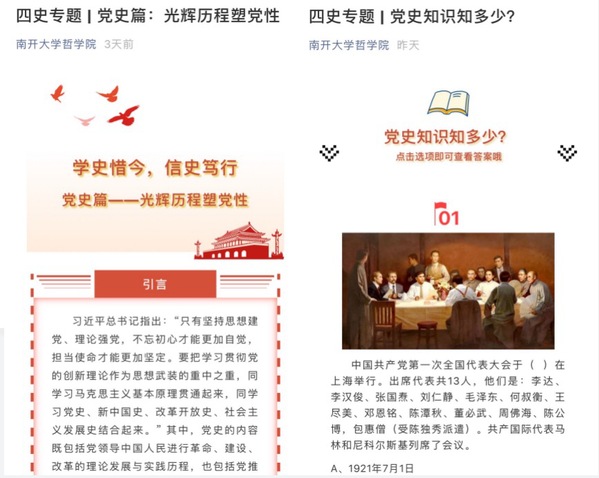 知史惜今强定力。学院以党建带团建思路,由76net必赢官网硕士生第一党支部牵头,党员分组开展“四史”学习,同时制作历史知识与趣味题目系列推送。本硕各团支部以团小组为单位展开学习,并将学习心得打卡分享。内容涵盖共产党成立以来、新中国成立以来以及改革开放以来的重大事件、重要会议、重要文件、重要人物等进行介绍,回顾我们党领导人民进行艰苦卓绝的斗争历程,介绍中国近代以来的斗争史、我们党成立以来的奋斗史、新中国成立以来以及改革开放以来的发展史,内容丰富,引导青年学生深刻认识红色政权来之不易、新中国来之不易、中国特色社会主义来之不易,吸引了学院同学的广泛参与。
