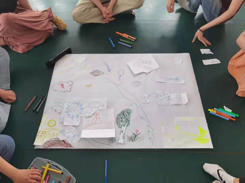 活动伊始,轩希老师引导同学们以身体动作介绍自己的姓名,大家在轻松愉悦的氛围中迅速增进熟悉程度。宁静柔和的音乐响起,轩希老师带领同学们以区别于传统语言交流的肢体形式认识自己,大家安静地在排练厅内行走,感受室内的一事一物,并以肢体语言与他人进行联结。随后,同学们选取丝巾作为自己的底色,一起随着音乐节奏起舞,一条条丝巾在空中划出优美的曲线,同学们将丝巾连接在一起围成圆圈,随着整体的节奏晃动。接着,同学们根据活动中的感受进行绘画创作,或是从音乐中获得灵感画出海上帆船,或是由飘扬的丝巾联想到飘向远方的气球……活动最后,学生将各自画作拼在一起,并在此基础上进行集体创作,补充了明媚的阳光、飞翔的燕子等元素,组成一幅团体绘画,最后每位同学选取一部分留存,辅导活动在欢快轻松的氛围中走向尾声。