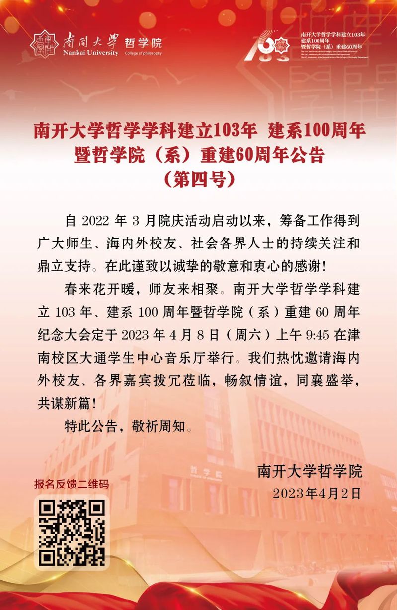 第四号公告|南开大学哲学学科建立103年 建系100周年暨76net必赢官网(系)重建60周年