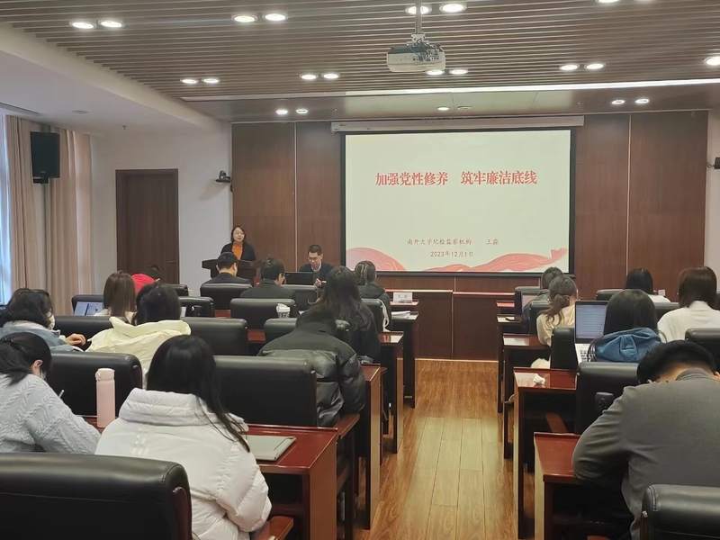 王淼以“加强党性修养,筑牢廉洁底线”为主题,以2018年全国组织工作会议为切入点,对党的纪律检查机构的发展历程、南开大学党组织发展历程及南开大学基层党组织和党员队伍有关情况进行了简要介绍。他强调,要坚持“两个确立”,做到“两个维护”,坚定理想信念,加强党性修养,敢于担当作为。党的二十大报告要求“坚持以严的基调强化正风肃纪”,强调“坚持党性党风党纪一起抓”,要充分认清加强党性修养的重要性,从多个着力点入手提高党性修养。青年学子要不忘初心、牢记使命,时刻将党章放在心中并用以指导自身实践。
