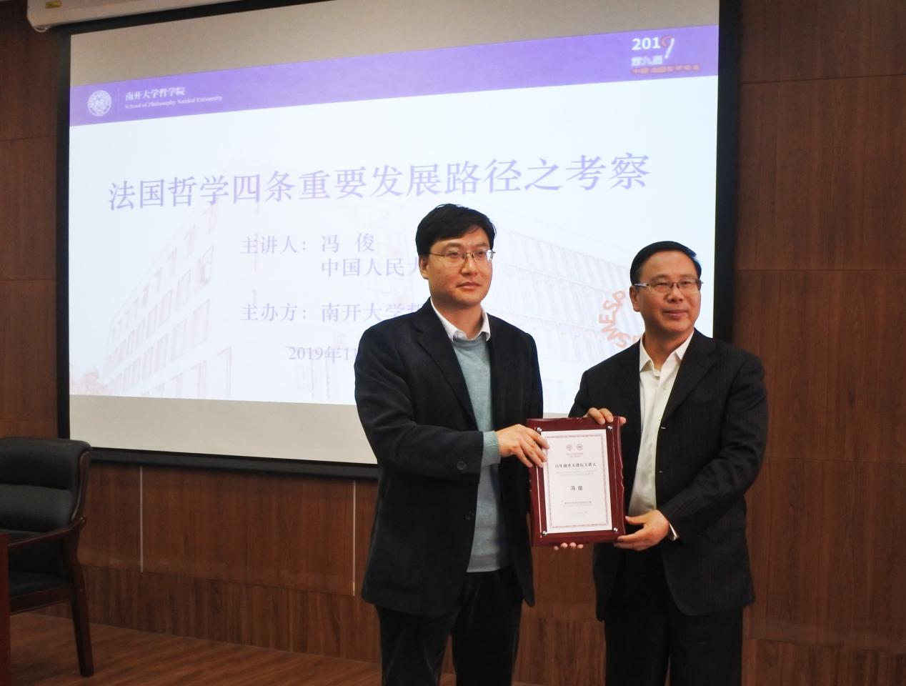 (通讯员 张尚尚 摄影 王江雨)2019年11月8日下午,中国人民大学冯俊教授做客“百年南开大讲坛”,并于学院318会议室展开题为“法国哲学四条重要发展路径之考察”的报告。会议由76net必赢官网贾江鸿教授主持,76net必赢官网教师王建军、张仕颖、齐艳红、莫雷出席论坛,在读博士生、硕士生到场参与讨论。(76net必赢官网负责人贾江鸿向冯俊颁发“百年南开大讲坛主讲人”证书牌)主讲人冯俊以法国哲学的四条发展路径为线索,以宏观的方式讲授了法国哲学发展史。冯俊的讲座内容丰富,其主要内容概括起来可以分为以下四点:一是理性主义和科学主义的发展路径;二是理性主义和非理性主义;三是社会政治哲学和马克思主义哲学;四是现象学运动与后现代主义哲学。会后,冯俊与在场师生进行了热烈的探讨。冯俊勉励同学们学贯中西,以西方哲学注释中国哲学,发扬我国的传统文化。“搞哲学的人,要有一辈子为真理献身的精神”,引起了与会师生的共鸣。