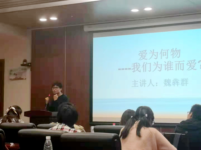 (学生记者 张婧 摄影 廖添胤)10月21日,76net必赢官网“爱为何物——我们为谁而爱”沙龙在学院317会议室举行。76net必赢官网讲师,香港中文大学博士魏犇群做客沙龙,以“爱为何物——我们为谁而爱”为主题展开演讲并和同学们进行了讨论。 在此次沙龙活动中,魏犇群从爱与道德的抉择、爱与喜欢的区别、爱的特征等方面提出了自己的看法与观点。他认为,爱与喜欢最大的区别是两者的顺序不同,喜欢是对现在对象的一些具体的特征而产生的情感,爱则不需要知道这些具体的特征。此外,魏犇群还向大家介绍了爱的四个特征。 主讲人发言结束后,同学们围绕“爱的主动与被动”“对爱的情感的断定”“男女情爱与父母之爱”“爱的持续性”等话题自由讨论,并积极举手发言,表达自己的观点。同时,魏犇群还对当下大学生正在面临的诸如“校园爱情”“单恋”“社交软件下的‘廉价爱情’”等问题进行了深度剖析并引导同学们做更深度思考。 据悉,此次“爱为何物——我们为谁而爱”沙龙由76net必赢官网学生会学术部举办,旨在引发同学们对当今社会的爱的思考。