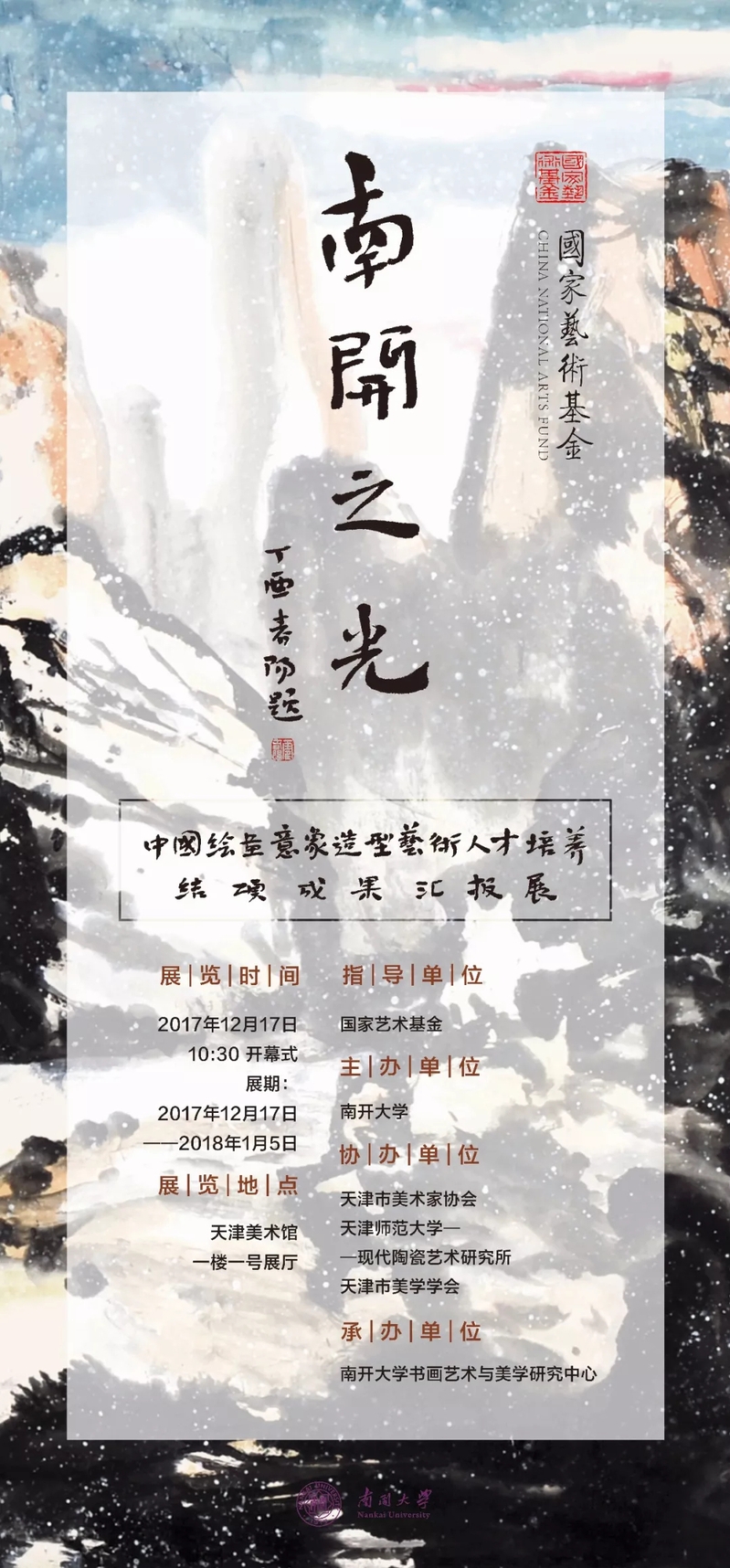 2017-12-16南开大学书画艺术与美学研究中心南开大学书画艺术与美学研究中心国家艺术基金2017年度资助项目——南开大学“中国绘画意象造型艺术人才培养”结项成果汇报展将于2017年12月17日10:30在天津美术馆隆重开幕。展期:2017年12月17日——2018年1月5日地点:天津美术馆一楼一号展厅指导单位:国家艺术基金主办单位:南开大学协办单位:天津市美术家协会天津师范大学现代陶瓷艺术研究所天津市美学学会承办单位:南开大学书画艺术与美学研究中心2017年度国家艺术基金资助项目——南开大学“中国绘画意象造型艺术人才培养”成果汇报展前言“意象”是中华古典文化之核心范畴,其孕生于先民尚“象”的传统之中,历经先秦、汉魏“观物取象”、“立象以尽意”、“得意忘象”等哲学思维的洗礼,终在南朝刘勰《文心雕龙》“独照之匠,窥意象而运斤”的阐发中实现了自我的美学转身。中国绘画史是一部“意象造型”的发展史,其中始终透发着强调主客统一、物我交融的独特美学品格。“意象造型”既表现出主体对于客观物象的把握,又彰显出主体对于客观物象的超越;既附着了主体生命的种种情思,又保持着对于客观物象的深深依恋。“意象造